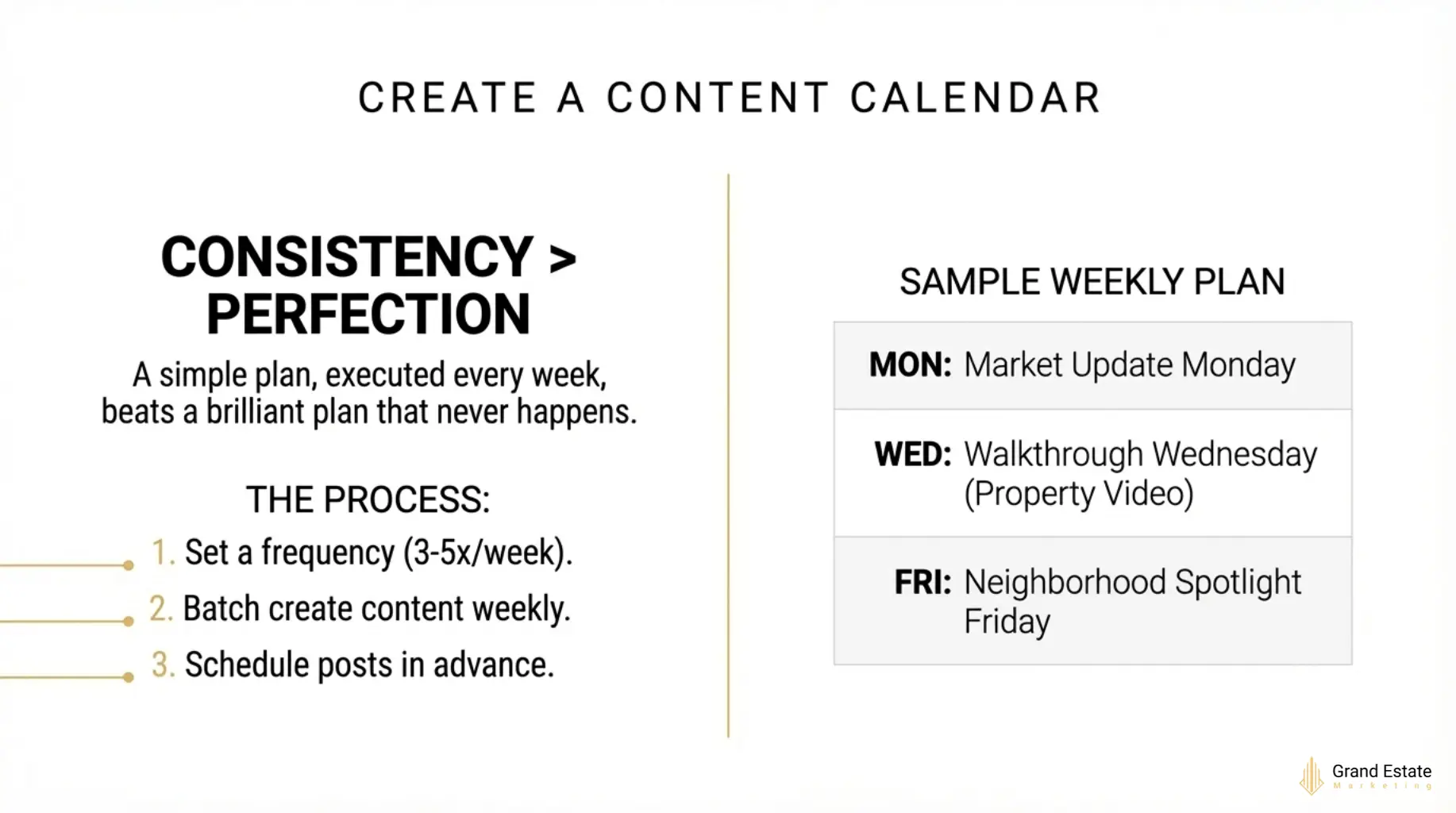 Plan content themes by day. For example: Monday market updates, Wednesday property features, Friday neighborhood spotlights. This structure makes content creation more manageable.